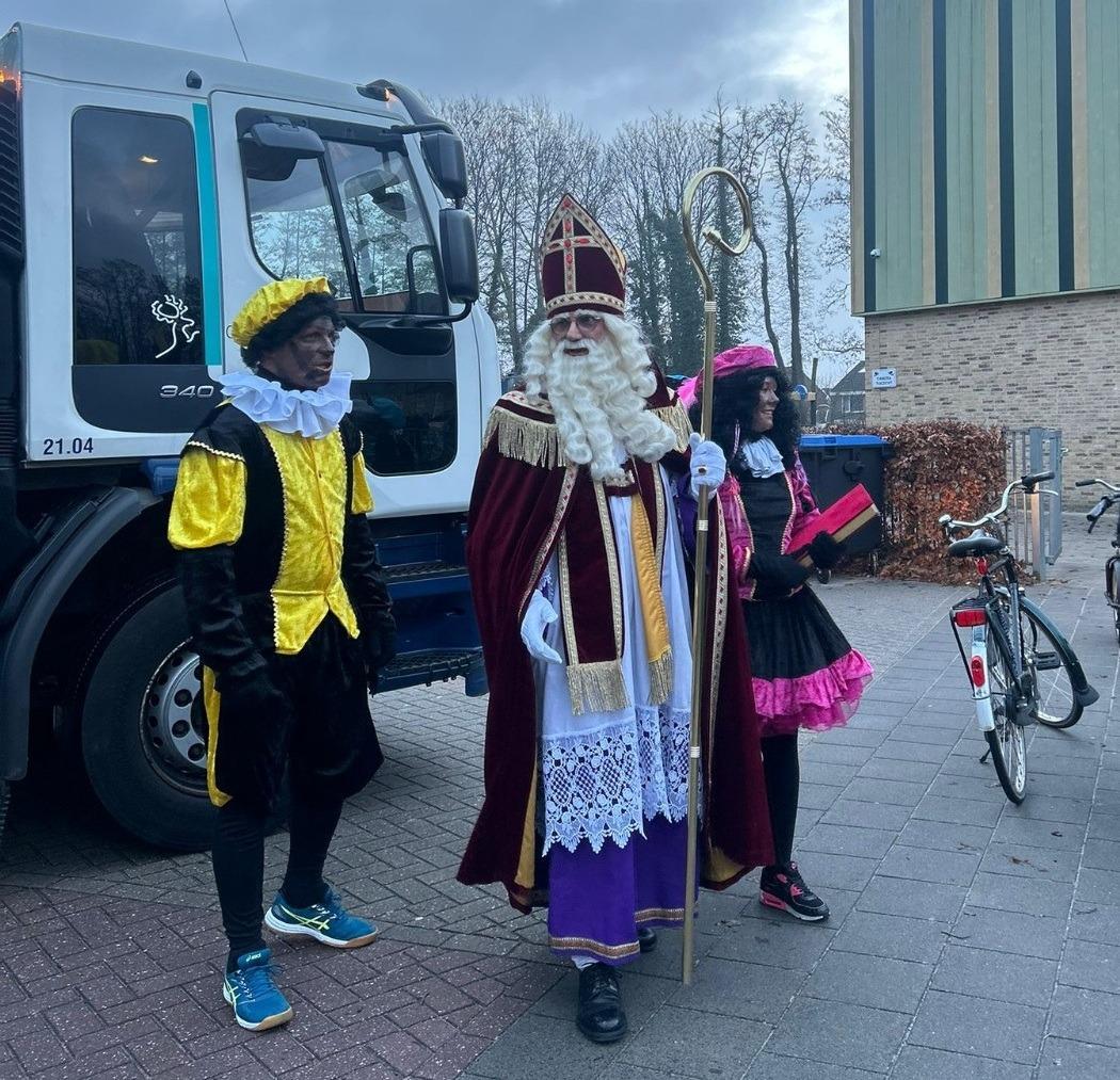 Vandaag zorgden Sinterklaas en de Pieten voor een grote verrassing op het schoolplein. Zij kwamen dit keer aanrijden in… een vuilniswagen! Onder luid gejuich stapten de Sint en zijn trouwe Pieten uit om alle kinderen te begroeten.